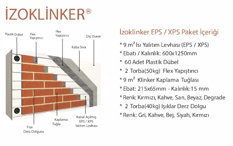 Kanallı XPS, Ustaoğlu klinker kaplama tuğlaları, Ustaoğlu flex yapıştırıcı, Ustaoğlu flex derz dolgu ve duvar cinsine göre seçilmiş plastik dübel ile paketler halinde hazır hale getirilmiş ısı yalıtım sistemleridir.